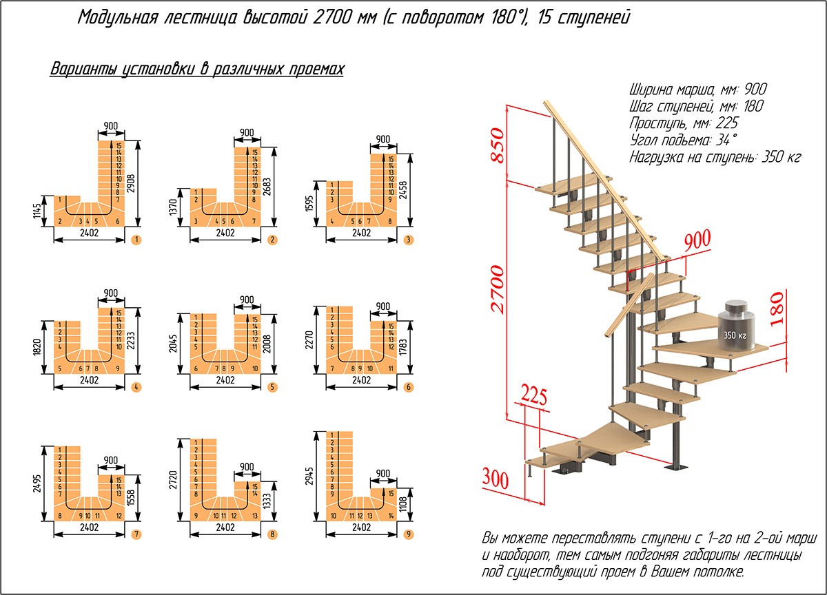 Модульная лестница высота 2700 мм (c поворотом 180°) высота ступени 180 мм