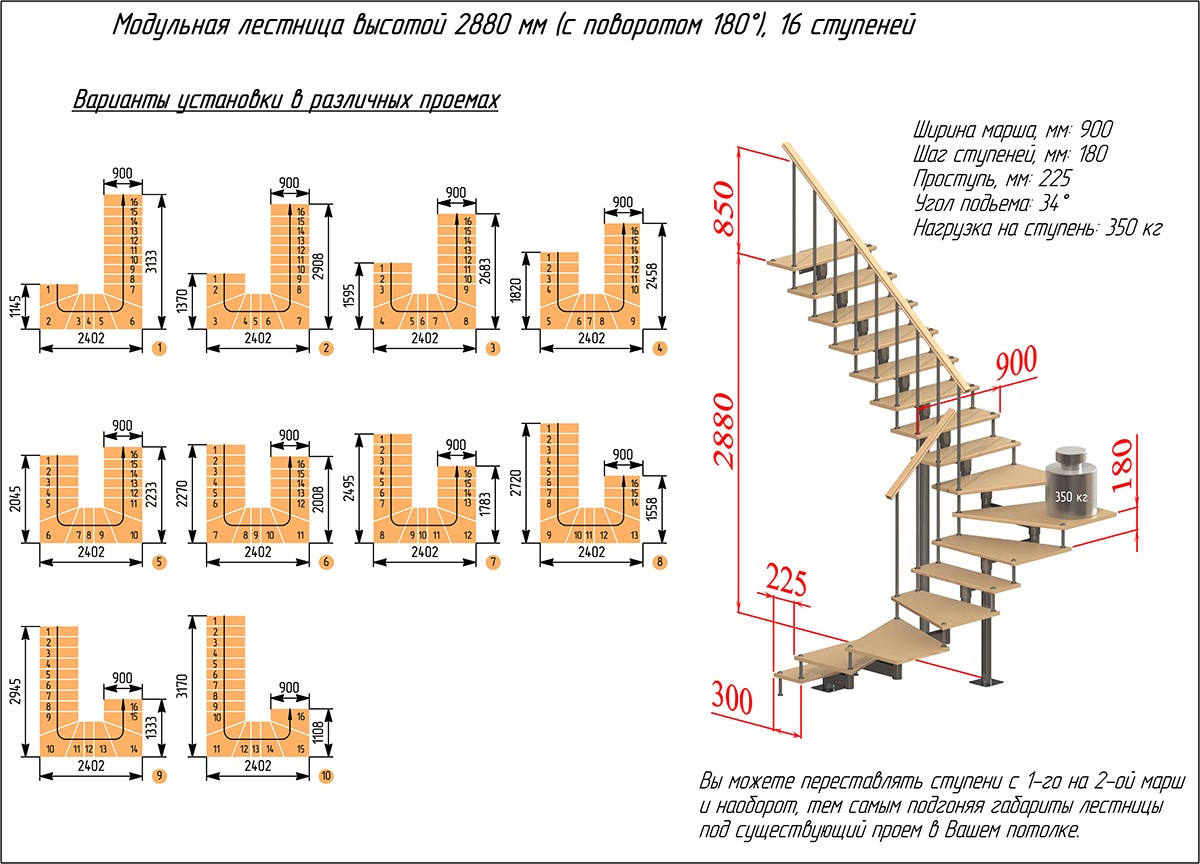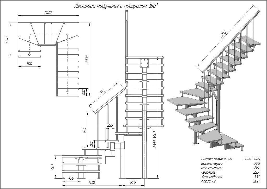 Модульная лестница высота 2880 мм (c поворотом 180°) высота ступени 180 мм