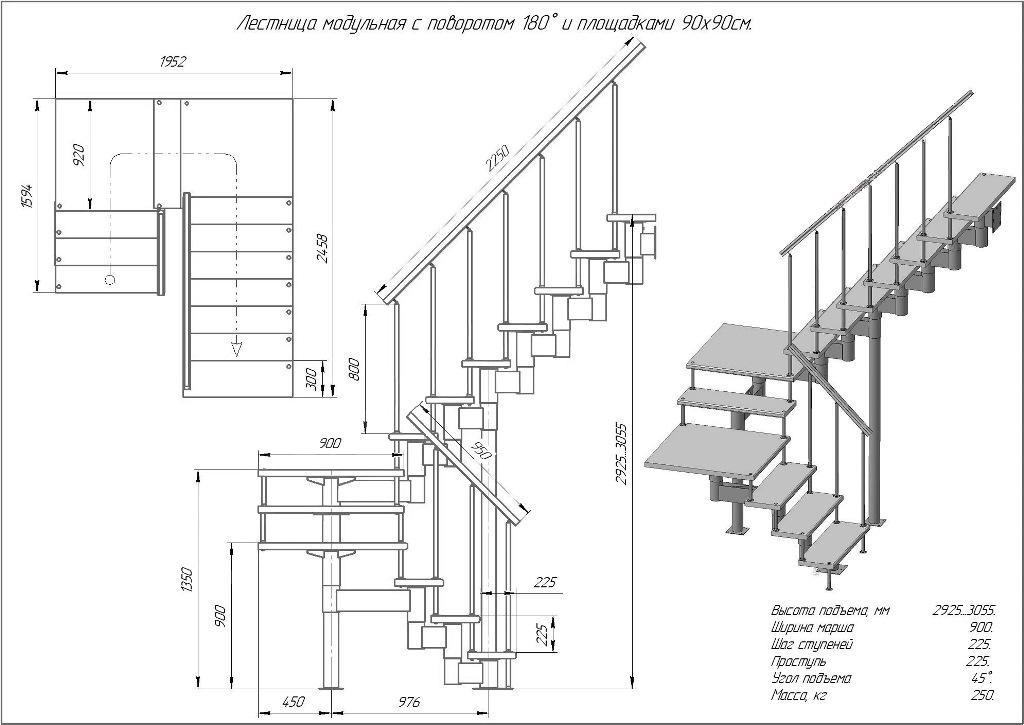 Модульная лестница высота 2925 мм (с поворотом 180° и площадками) высота ступени 225 мм