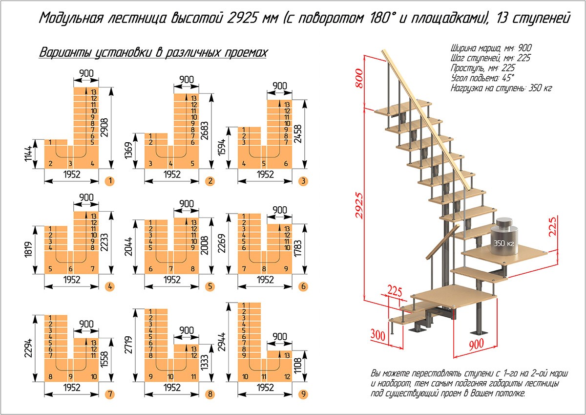 Скачать каталогМодульная лестница (с поворотом на 180°) на больцах с двумя площадками высотой 2925 мм предназначена для эксплуатации в двухуровневых квартирах и коттеджах. Материал: каркас (элементы, пластины, балясины и опоры) — сталь; ступени, поручни — древесина (сосна). Лестница поставляется в упакованном, разобранном виде и собирается на объекте монтажа по указаниям, инструкции по сборке лестницы. Количество модульных элементов подбирается исходя из необходимой высоты лестницы. С более подробными правилами сборки можно ознакомиться в разделе "Монтаж лестниц" Для обеспечения комфортного и безопасного использования лестницы, при комплектовании рекомендуется соблюдать правила: во всех модификациях обязательны верхний 1шт. и нижний 1шт. фиксирующий элемент; количество промежуточных элементов определяется из расчета: высота подъема, разделенная на 225 мм (шаг лестницы) минус 2шт.; опоры выбираются в зависимости от высоты подъёма: при высоте подъема менее 1.8 м выбирают маленькую опору (L-1000 mm) , при высоте подъема в более 1.8 м выбирают малую и большую опору (L-1000mm и L-2000mm); количество деревянных ступеней должно быть равным количеству всех установочных элементов; количество малых балясин (L-800mm) должно быть равным количеству больших балясин (L-900mm); количество стоек перил (балясин) при прямой модификации должно быть равным удвоенному количеству ступенек (при стенном опирании) и учетверенному при центральном расположении; при поворотной модификации количество стоек перил (балясин) должно быть равным удвоенному количеству прямых ступенек; количество и длину перил выбирают из расчета высоты подъема, модификации и расположения лестницы.