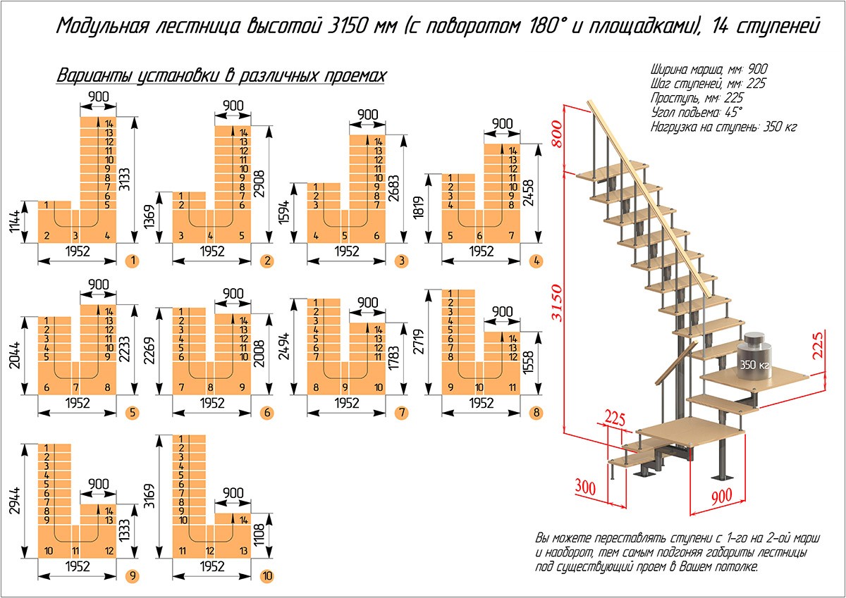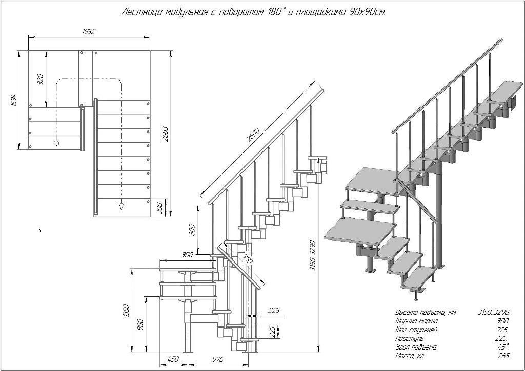 Модульная лестница высота 3150 мм (с поворотом 180° и площадками) высота ступени 225 мм