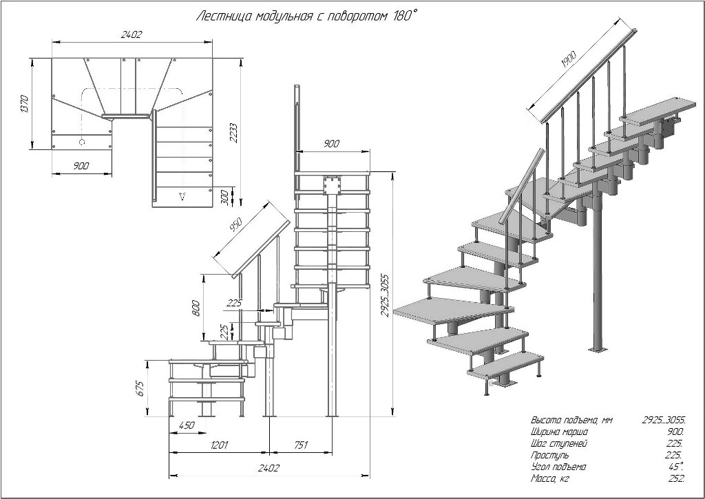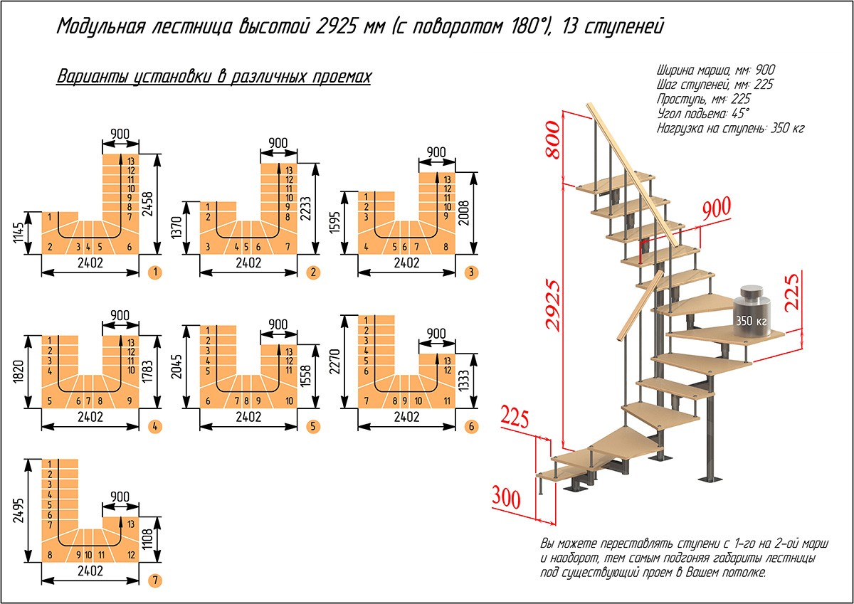 Модульная лестница высота 2925 мм (с поворотом 180°) высота ступени 225 мм