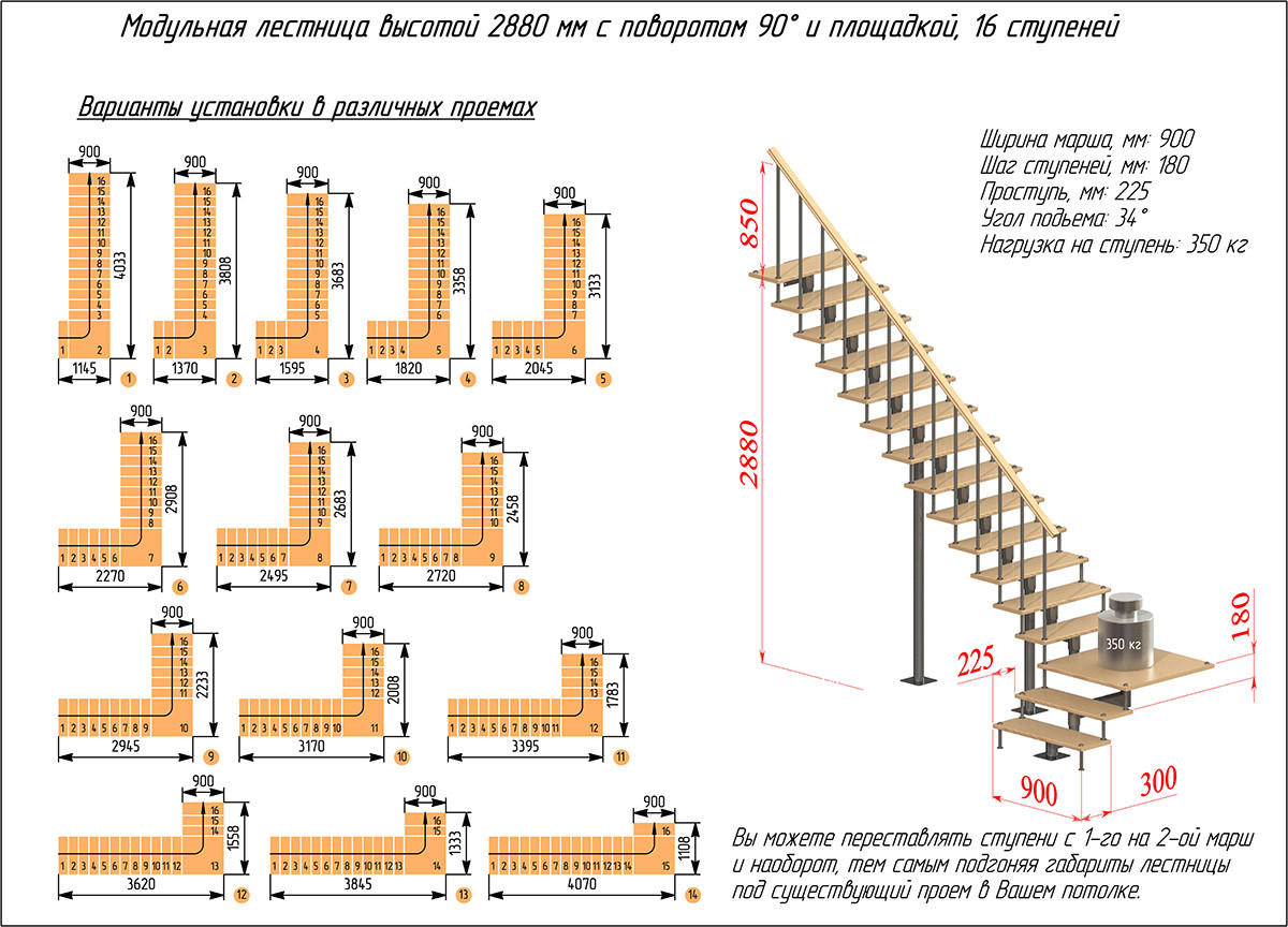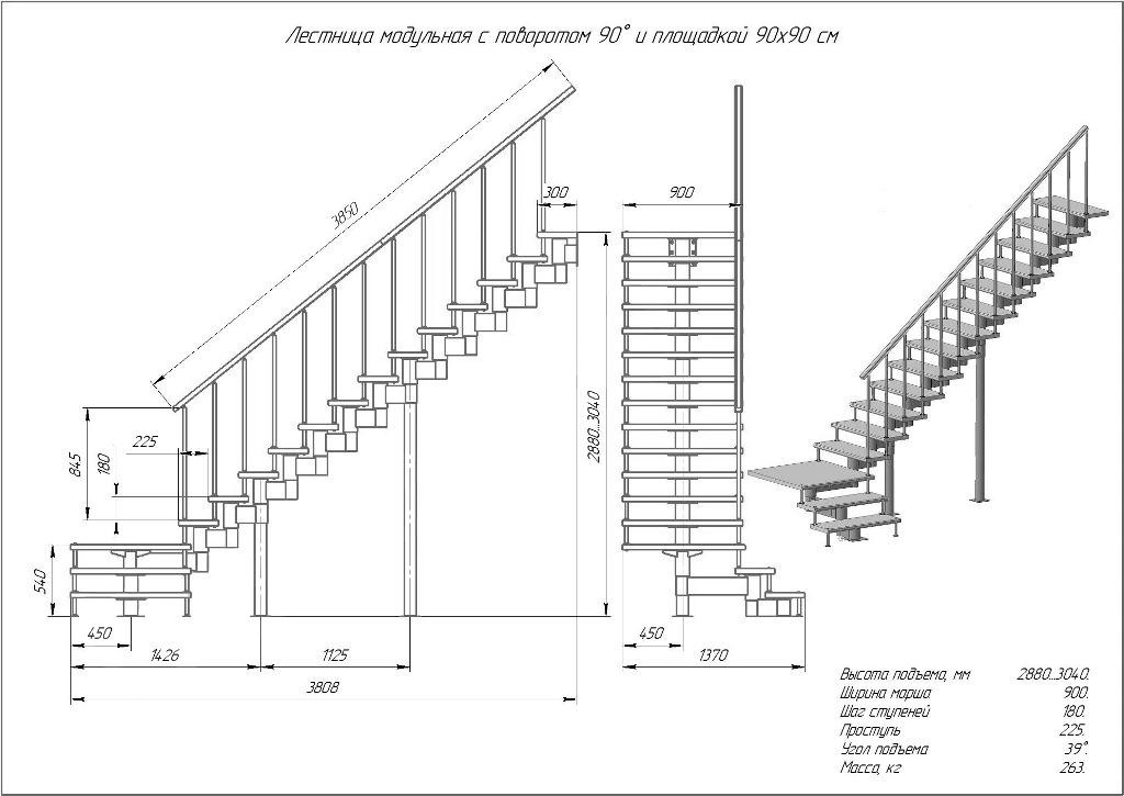 Модульная лестница высота 2880 мм (с поворотом 90° и площадкой) высота ступени 180 мм
