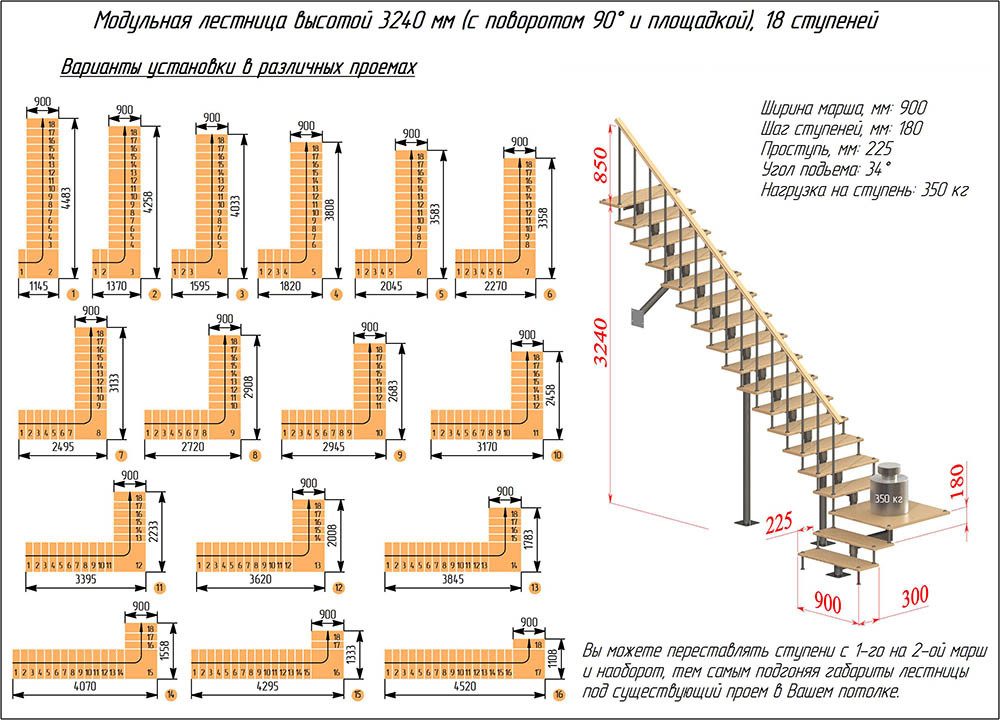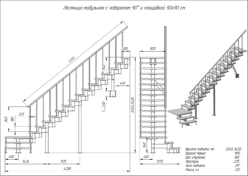 Модульная лестница высота 3240 мм (с поворотом 90° и площадкой) высота ступени 180 мм