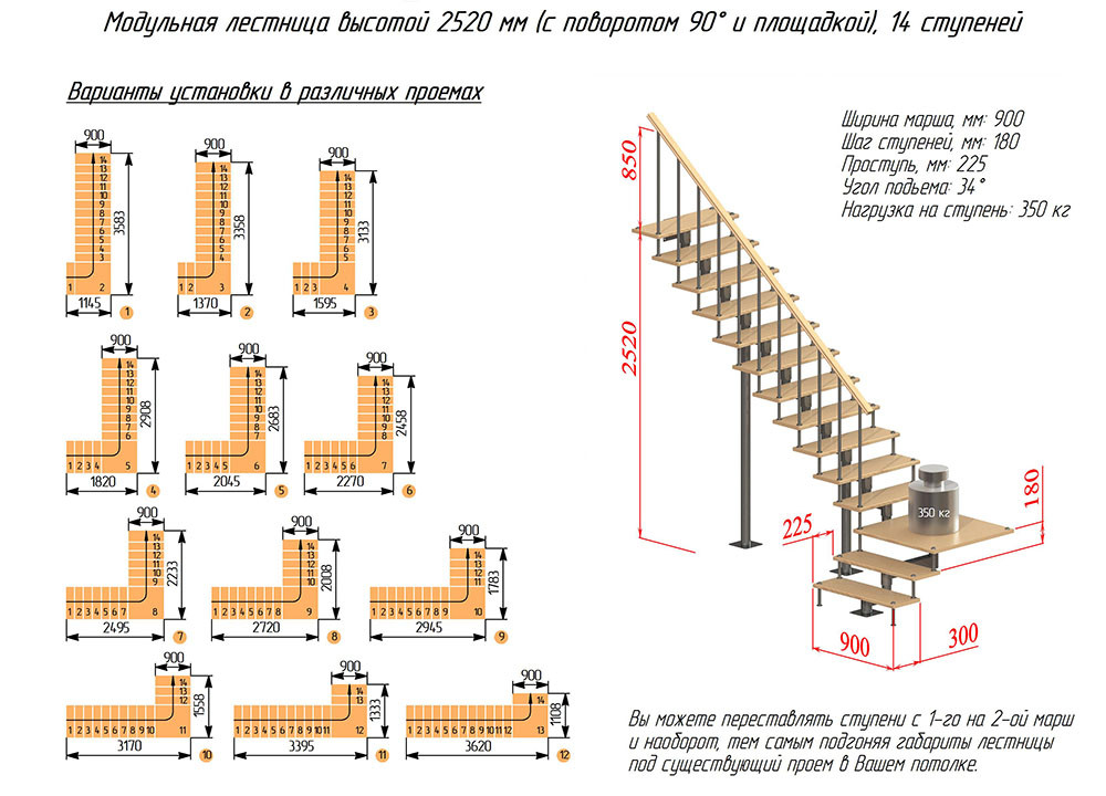 Модульная лестница высота 2520 мм (с поворотом 90° и площадкой) высота ступени 180 мм