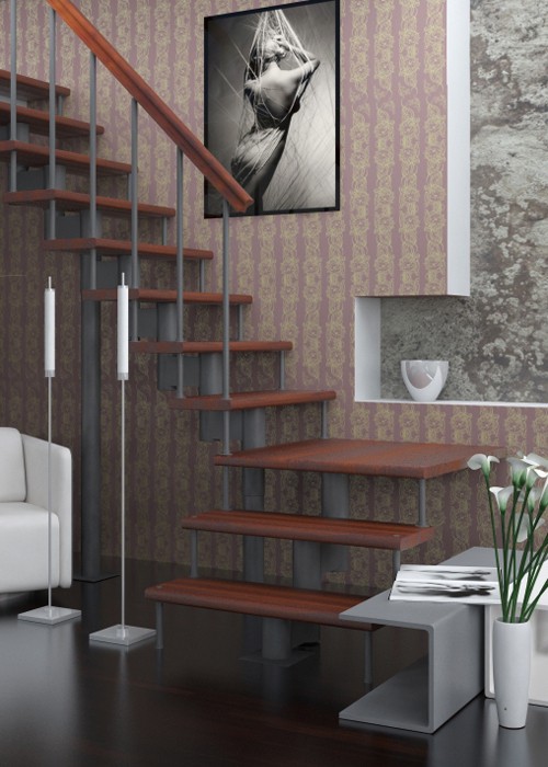 Скачать каталогМодульная лестница с поворотом на 90° и площадкой на больцах высотой 2700 мм предназначена для эксплуатации в двухуровневых квартирах и коттеджах. Материал: каркас (элементы, пластины, балясины и опоры) — сталь; ступени, поручни — древесина (сосна). Лестница поставляется в упакованном, разобранном виде и собирается на объекте монтажа по указаниям, приведённым в инструкции по сборке лестницы. Количество модульных элементов подбирается исходя из необходимой высоты лестницы. С более подробными правилами сборки можно ознакомиться в разделе "Монтаж лестниц" Для обеспечения комфортного и безопасного использования лестницы, при комплектовании рекомендуется соблюдать правила: во всех модификациях обязательны верхний 1шт. и нижний 1шт. фиксирующий элемент; количество промежуточных элементов определяется из расчета: высота подъема, разделенная на 225 мм (шаг лестницы) минус 2шт.; опоры выбираются в зависимости от высоты подъёма: при высоте подъема менее 1.8 м выбирают маленькую опору (L-1000 mm) , при высоте подъема в более 1.8 м выбирают малую и большую опору (L-1000mm и L-2000mm); количество деревянных ступеней должно быть равным количеству всех установочных элементов; количество малых балясин (L-800mm) должно быть равным количеству больших балясин (L-900mm); количество стоек перил (балясин) при прямой модификации должно быть равным удвоенному количеству ступенек (при стенном опирании) и учетверенному при центральном расположении; при поворотной модификации количество стоек перил (балясин) должно быть равным удвоенному количеству прямых ступенек; количество и длину перил выбирают из расчета высоты подъема, модификации и расположения лестницы.