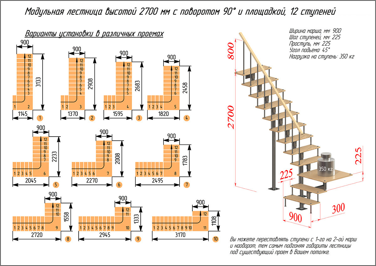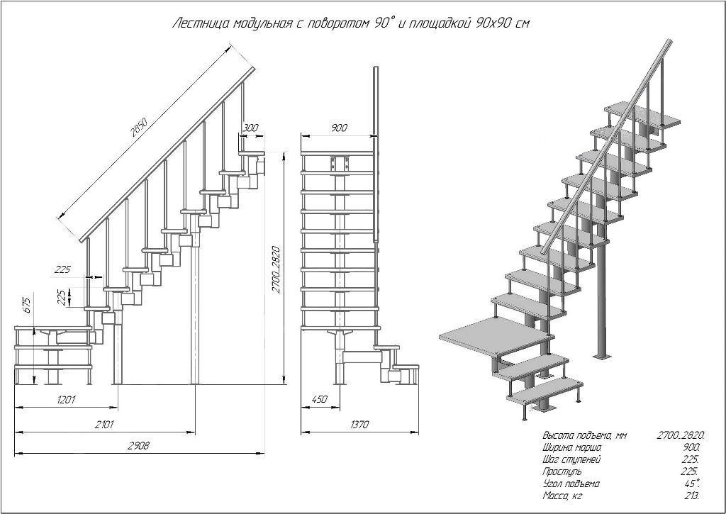 Модульная лестница высота 2700 мм (с поворотом 90° и площадкой) высота ступени 225 мм