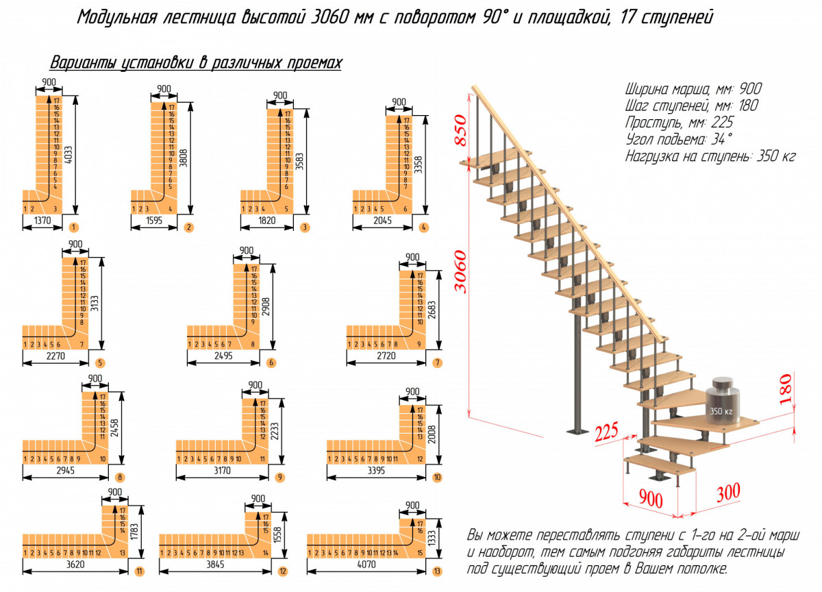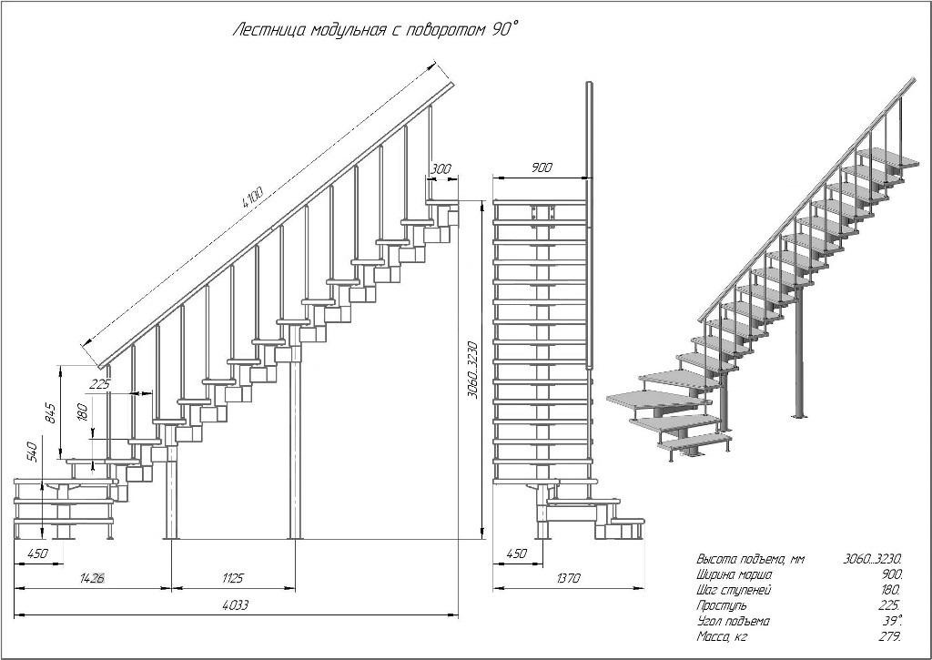 Модульная лестница высота 3060 мм (с поворотом 90°) высота ступени 180 мм