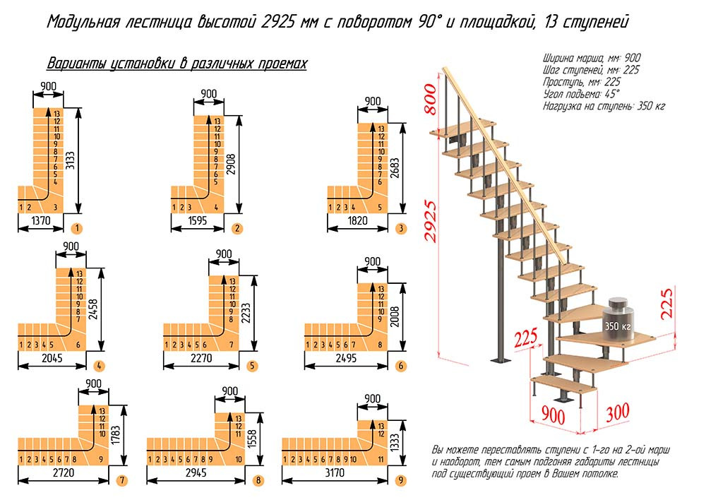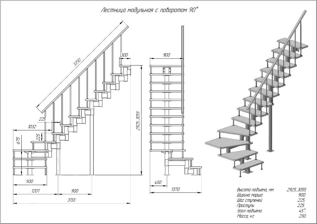 Модульная лестница высота 2925 мм (с поворотом 90°) высота ступени 225 мм