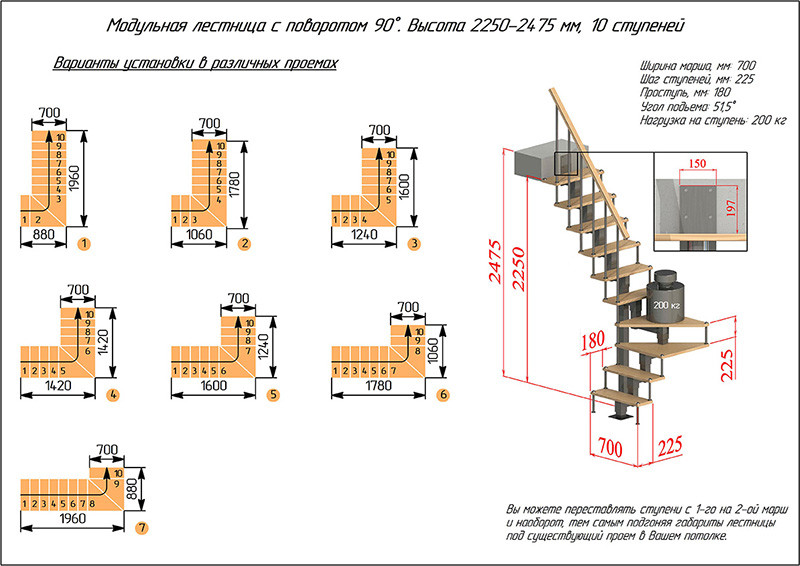 Скачать каталогМодульная лестница квадратный профиль (с поворотом 90°) - на модулях из квадратного профиля предназначена для эксплуатации в двухуровневых квартире, коттедже, загородного доме и дачи для подъема на второй этаж. Регулируется добавлением модуля, высота которого составляет 225 мм. На высоту 2,25 м нужно 9 модулей, 2,45-10 модулей Изготовлена из: каркас (элементы, пластины, балясины и опоры) — сталь; ступени, поручни — древесина (сосна).