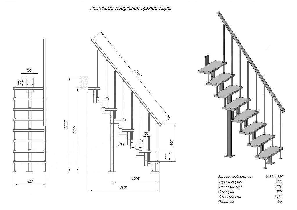 Скачать каталогМалогабаритная модульная лестница (Прямой марш) - это лестница, собираемая из металлических модулей квадратного профиля. Предназначена для эксплуатации в двухуровневой квартире, коттедже, загородном доме, на даче для подъема на второй этаж. Состоит из стального окрашенного каркаса (элементы, пластины, балясины и опоры) и деревянных ступеней и поручней (сосна). Лестница поставляется в упакованном, разобранном виде и собирается по месту на объекте как описано в инструкции по сборке лестницы. В паспорте лестницы прописаны все характеристики и описание на конкретную модель. Комплектация: промежуточные элементы (квадратный профиль), ступени прямые (ширина 700 мм), стойки перил, опоры лестницы (квадратный профиль), поручень фигурный (перила), больца. Количество элементов лестницы в наборе зависит от модели и ее высоты.