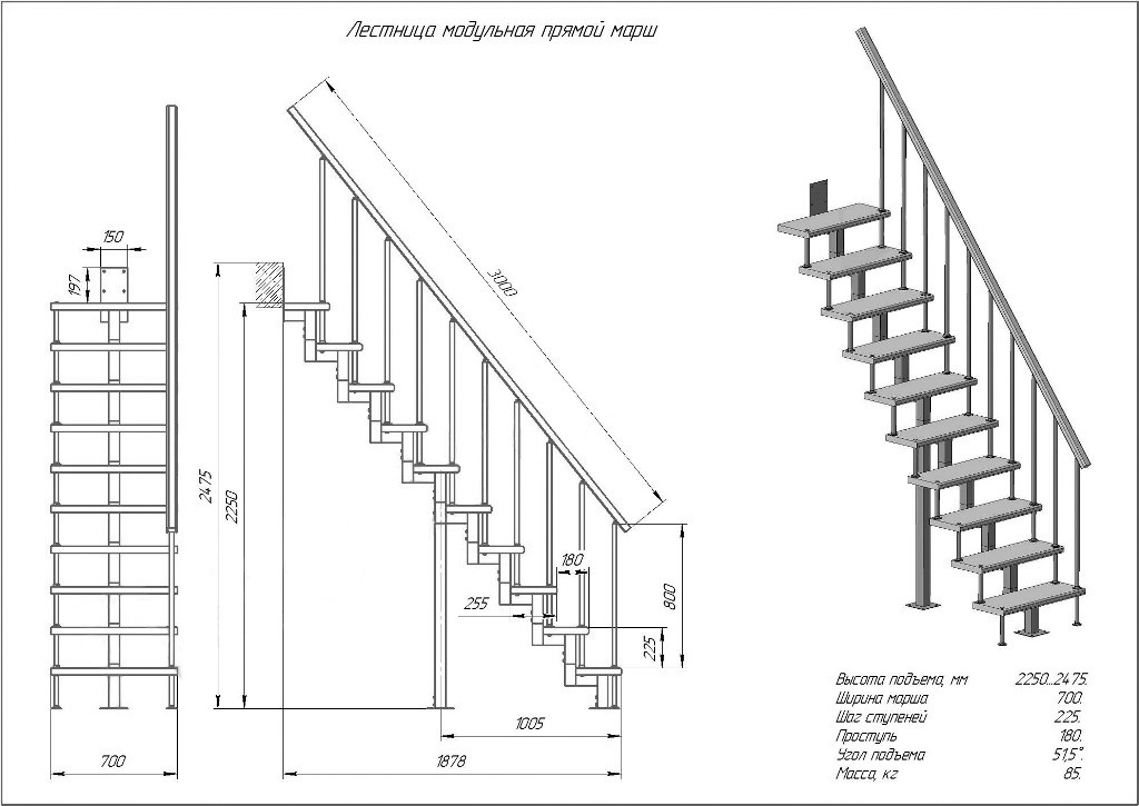 Скачать каталогЛестница модульная (Прямой марш) - это металлическая лестница из модулей квадратного профиля. Предназначена для эксплуатации в двухуровневой квартире, коттедже, загородном доме и дачи для подъема на второй этаж. Изготовлена из: каркас (элементы, пластины, балясины и опоры) — сталь; ступени, поручни — древесина (сосна). Лестница поставляется в упакованном, разобранном виде и собирается по месту на объекте как описано в инструкции по сборке лестницы. В паспорте лестницы прописаны все характеристики и описание на конкретную модель. Комплектация: Промежуточный элемент (квадратный профиль): 8 шт. Ступень прямая (700мм): 10 шт. Стойка перил 800 мм: 10 шт. Опора лестницы (квадратный профиль) 1000 мм: 1 шт. Поручень фигурный(перила) 3000 мм: 1 шт. Больц: 20 шт.