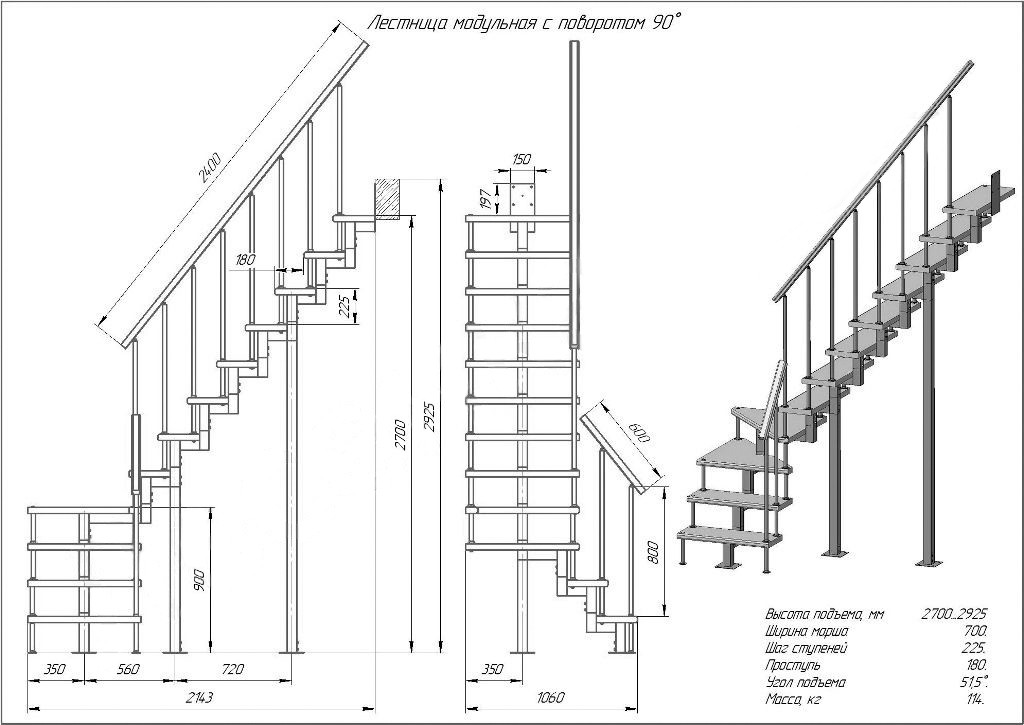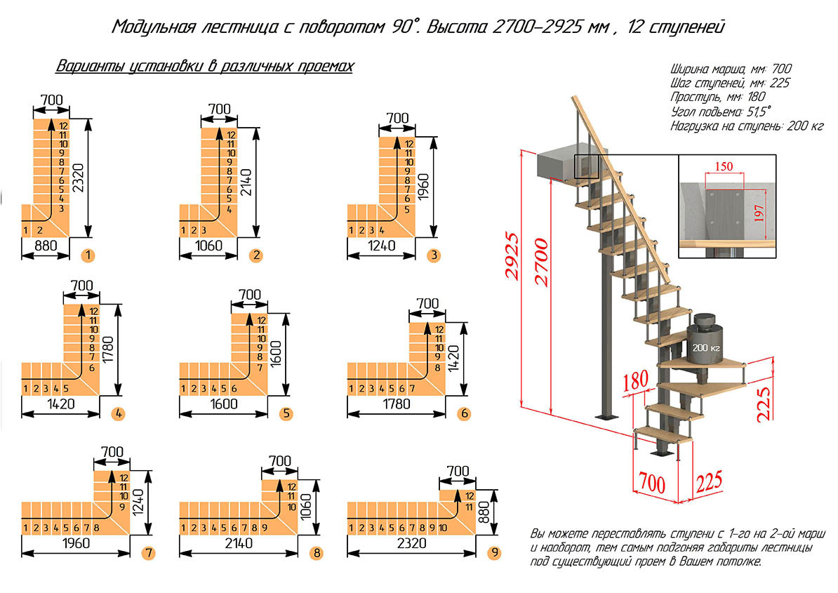 Модульная лестница высота 2700-2925 мм кв. профиль (поворот 90°) 12 ступеней, высота ступени 225 мм