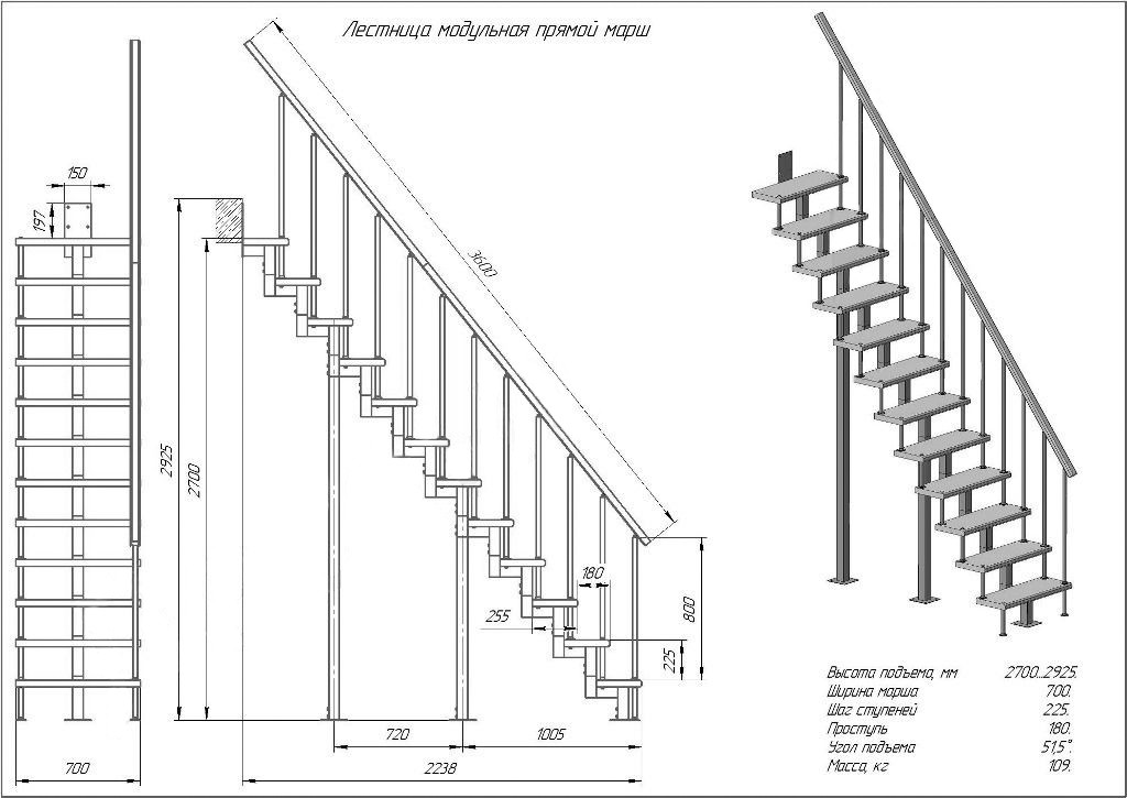 Скачать каталогЛестница модульная (Прямой марш) - это металлическая лестница из модулей квадратного профиля. Предназначена для эксплуатации в двухуровневой квартире, коттедже, загородном доме и дачи для подъема на второй этаж. Изготовлена из: каркас (элементы, пластины, балясины и опоры) — сталь; ступени, поручни — древесина (сосна). Лестница поставляется в упакованном, разобранном виде и собирается по месту на объекте как описано в инструкции по сборке лестницы. В паспорте лестницы прописаны все характеристики и описание на конкретную модель. Комплектация: Промежуточный элемент (квадратный профиль): 10 шт. Ступень прямая (700мм): 12 шт. Стойка перил 800 мм: 12 шт. Опора лестницы (квадратный профиль) 1000 мм: 2 шт. Поручень фигурный (перила) 3600 мм: 1 шт. Больц: 24 шт.