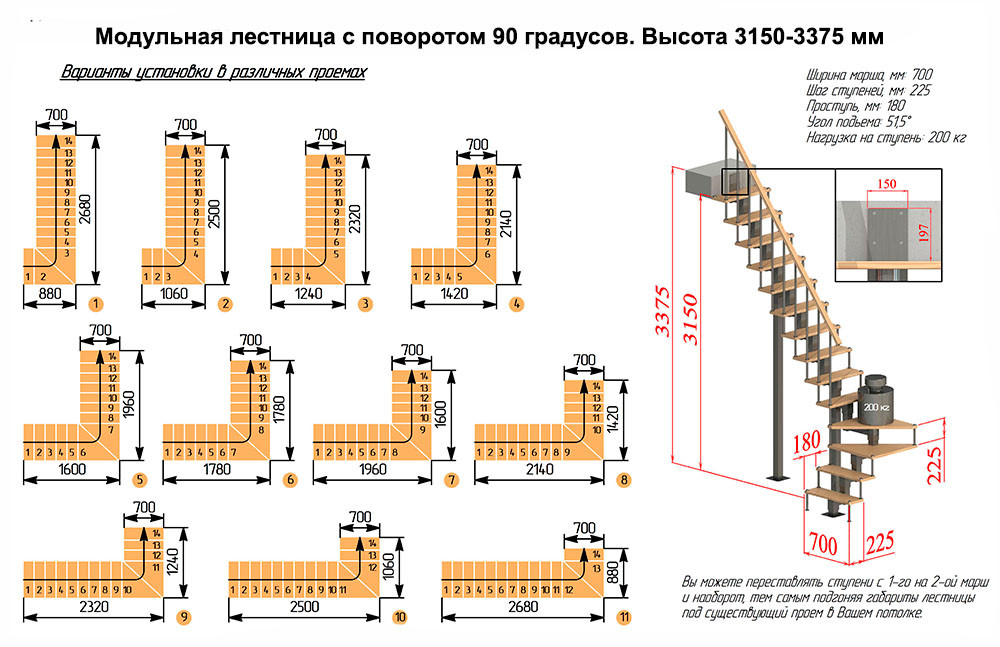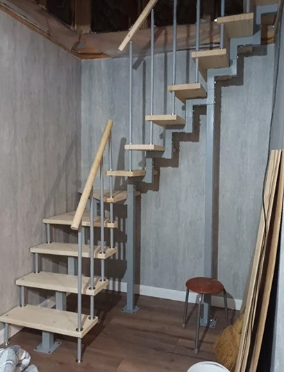 Скачать каталогМалогабаритная модульная лестница (с поворотом 90°) - это лестница, собираемая из металлических модулей квадратного профиля. Предназначена для эксплуатации в двухуровневой квартире, коттедже, загородном доме, на даче для подъема на второй этаж. Состоит из стального окрашенного каркаса (элементы, пластины, балясины и опоры) и деревянных ступеней и поручней (сосна). Лестница универсальная - может быть установлена с поворотом как вправо, так и влево. Лестница поставляется в упакованном, разобранном виде и собирается по месту на объекте как описано в инструкции по сборке лестницы. В паспорте лестницы прописаны все характеристики и описание на конкретную модель. Комплектация: промежуточные элементы (квадратный профиль), ступени прямые (ширина 700 мм), комплект ступеней поворота, стойки перил, опоры лестницы (квадратный профиль), поручень фигурный (перила), больца. Количество элементов лестницы в наборе зависит от модели и ее высоты. Вы можете переставлять ступени на первом и втором марше лестницы в зависимости от размера вашего проема. При этом общее количество ступеней не меняется!
