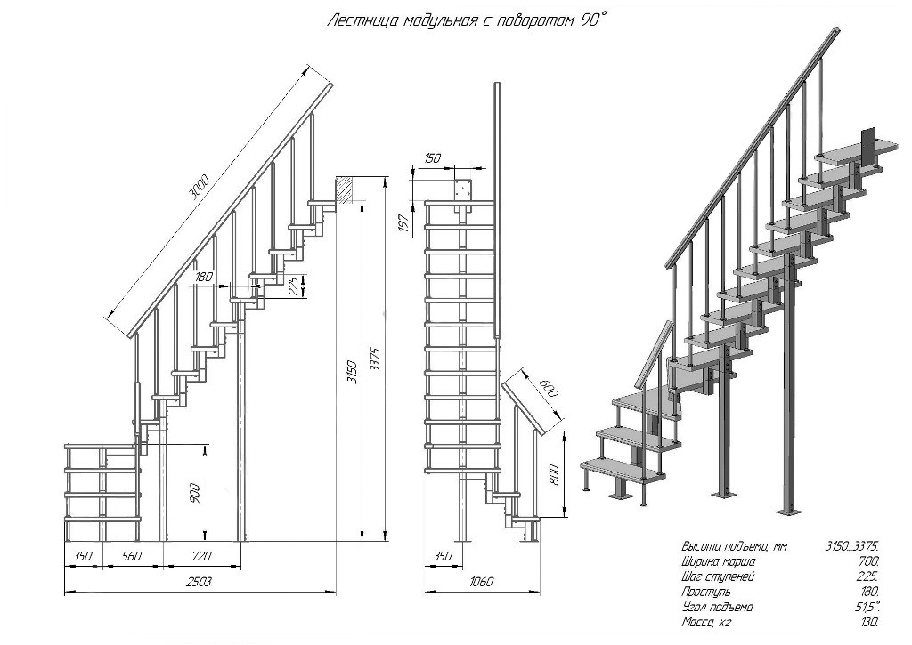 Модульная лестница высота 3150-3375 мм кв. профиль (поворот 90°) 14 ступеней, высота ступени 225 мм