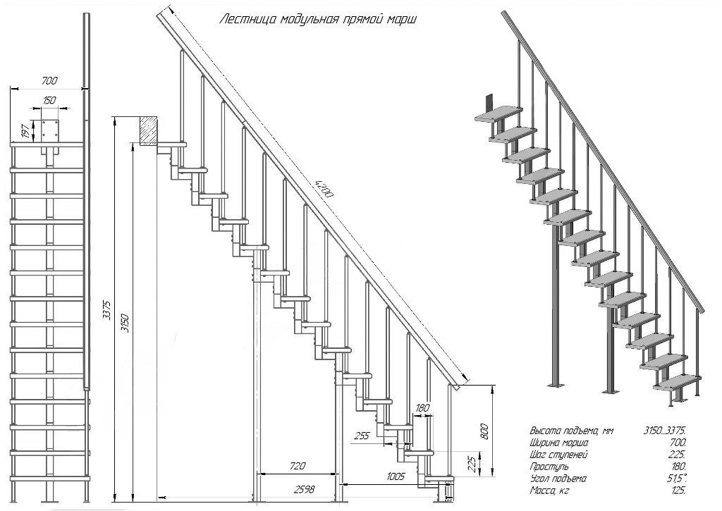Скачать каталогМалогабаритная модульная лестница (Прямой марш) - это лестница, собираемая из металлических модулей квадратного профиля. Предназначена для эксплуатации в двухуровневой квартире, коттедже, загородном доме, на даче для подъема на второй этаж. Состоит из стального окрашенного каркаса (элементы, пластины, балясины и опоры) и деревянных ступеней и поручней (сосна). Лестница поставляется в упакованном, разобранном виде и собирается по месту на объекте как описано в инструкции по сборке лестницы. В паспорте лестницы прописаны все характеристики и описание на конкретную модель. Комплектация: промежуточные элементы (квадратный профиль), ступени прямые (ширина 700 мм), стойки перил, опоры лестницы (квадратный профиль), поручень фигурный (перила), больца. Количество элементов лестницы в наборе зависит от модели и ее высоты.
